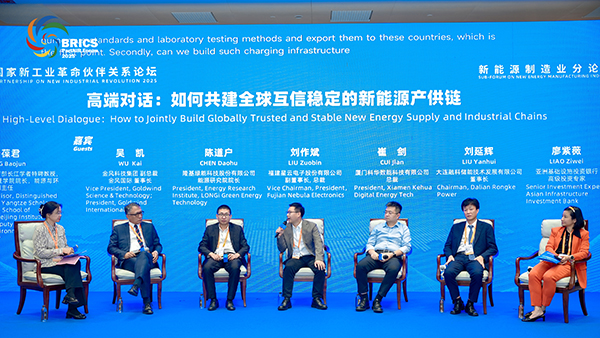 在分論壇的高端對(duì)話環(huán)節(jié),星云股份副董事長兼總裁劉作斌與行業(yè)企業(yè)、專家學(xué)者、機(jī)構(gòu)代表等同臺(tái)分享。星云股份近年來積極響應(yīng)金磚合作倡議,拓展包括印度在內(nèi)的金磚國家市場,并通過領(lǐng)先的鋰電池檢測產(chǎn)品與服務(wù)、電池智能制造解決方案、充檢一體設(shè)備等,持續(xù)為金磚國家新能源產(chǎn)業(yè)鏈發(fā)展提供關(guān)鍵技術(shù)支持。劉作斌總裁主張通過建立全球統(tǒng)一的技術(shù)標(biāo)準(zhǔn)與認(rèn)證互認(rèn)體系來共建互信穩(wěn)定的新能源產(chǎn)供鏈,并通過將高精度、高可靠性的檢測數(shù)據(jù)作為行業(yè)的“通用語言”,實(shí)現(xiàn)從“電芯→模組→PACK”全生命周期的質(zhì)量可追溯、可驗(yàn)證,打破不同國家之間在新能源領(lǐng)域的技術(shù)壁壘與信任隔閡,讓電池的安全與性能成為全球市場互認(rèn)的“硬通貨”,最終推動(dòng)新能源產(chǎn)業(yè)在透明、協(xié)作、互信的基礎(chǔ)上實(shí)現(xiàn)高質(zhì)量可持續(xù)發(fā)展。