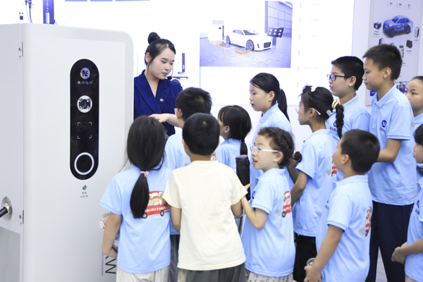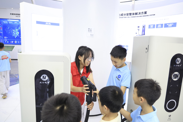 宣傳片觀看結(jié)束后,孩子們最期待的展廳探秘環(huán)節(jié)正式開始。在講解員和志愿者的帶領(lǐng)下,孩子們步入了展廳,沉浸式感受科技的魅力。講解員用生動易懂的語言,結(jié)合香港大學(xué)志愿者們的實物操作演示,將復(fù)雜的鋰電池檢測技術(shù)、新能源汽車充電技術(shù)講述得妙趣橫生、直白易懂。孩子們興致勃勃,認(rèn)真聆聽講解。