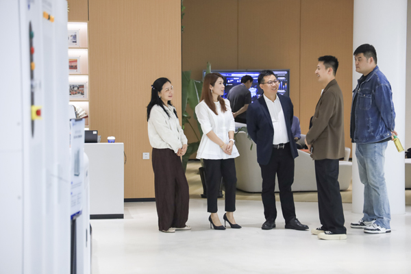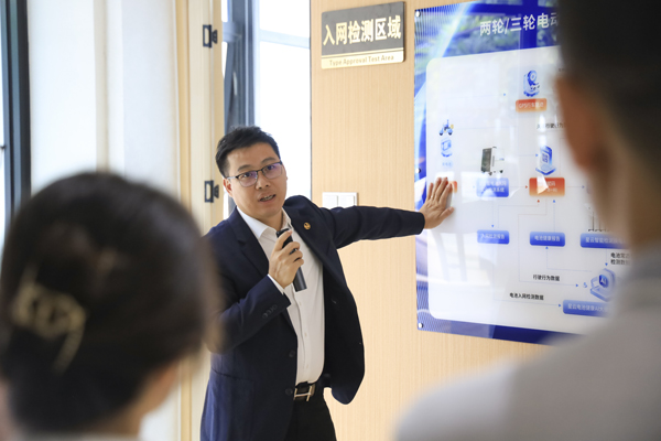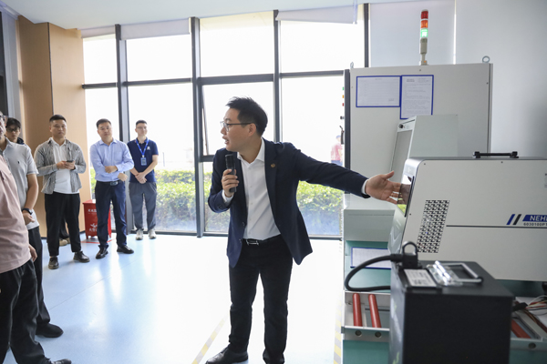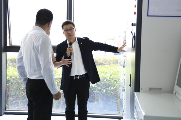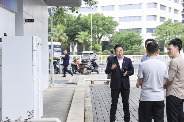 星云股份副董事長兼總裁劉作斌帶領(lǐng)客戶嘉賓參觀、體驗電動自行車、電動摩托車電池檢測